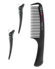 Peine de carbono extra fuerte y dos pinzas para el cabello que mantienen el cabello en su lugar durante el peinado o el corte.