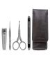 Contiene un cortaúñas, una lima para limar y limpiar debajo de la uña, unas tijeras redondeadas para el vello púbico y unas pinzas puntiagudas.